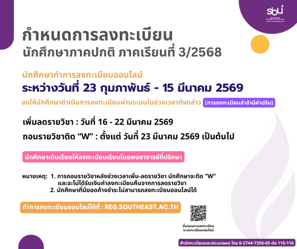 |  | กำหนดการลงทะเบียนเรียนนักศึกษาภาคปกติ ภาคเรียนที่ 3/2568 นักศึกษาภาคปกติทำการลงทะเบียนเรียน ภาคเรียนที่ 3/2568 ผ่านระบบทะเบียนออนไลน์